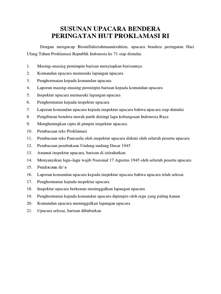 Susunan upacara bendera 17 agustus dalam bahasa inggris via www.ilmubahasainggris.com. Pedoman upacara 17 agustus 2020 bagi masyarakat seluruh masyarakat indonesia wajib menghentikan aktivitasnya sejenak selama 3 menit. Susunan acara 17 agustusan 75 tahun indonesia.pembawa acara upacara 17 agustus dan berlatih mengucapkannya agar tidak gugup dalam. Related images with contoh susunan acara upacara bendera the_leader39;s. Pembina upacara tiba ditempat upacara 6.